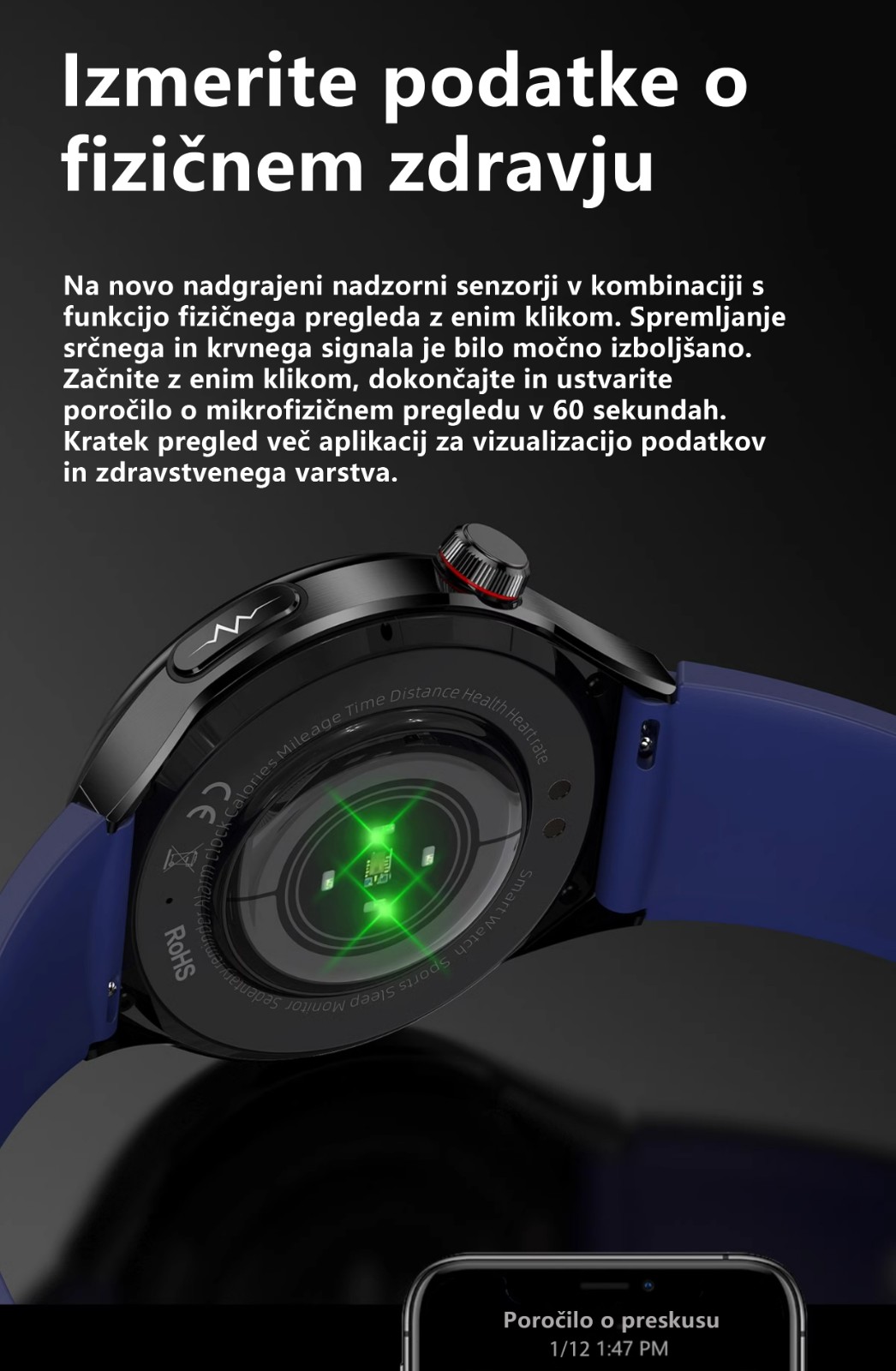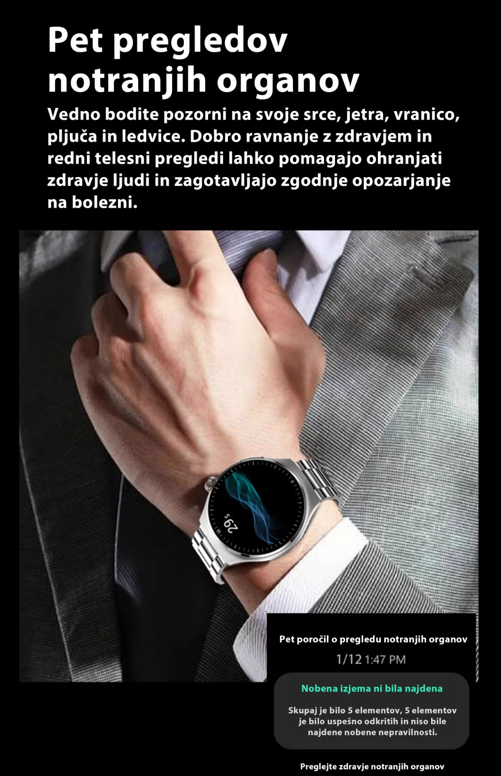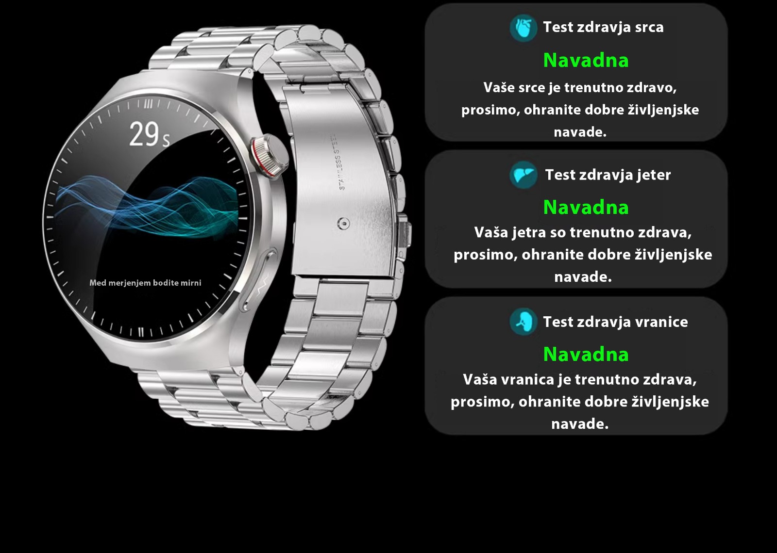 Neinvazivno merjenje krvnega sladkorja/krvnega tlaka/sečne kisline + ocena sladkorne bolezni + natančno merjenje krvnega tlaka in srčnega utripa + celoten telesni pregled + analiza delovanja srca in možganov + natančno merjenje kisika v krvi in srčnega ut