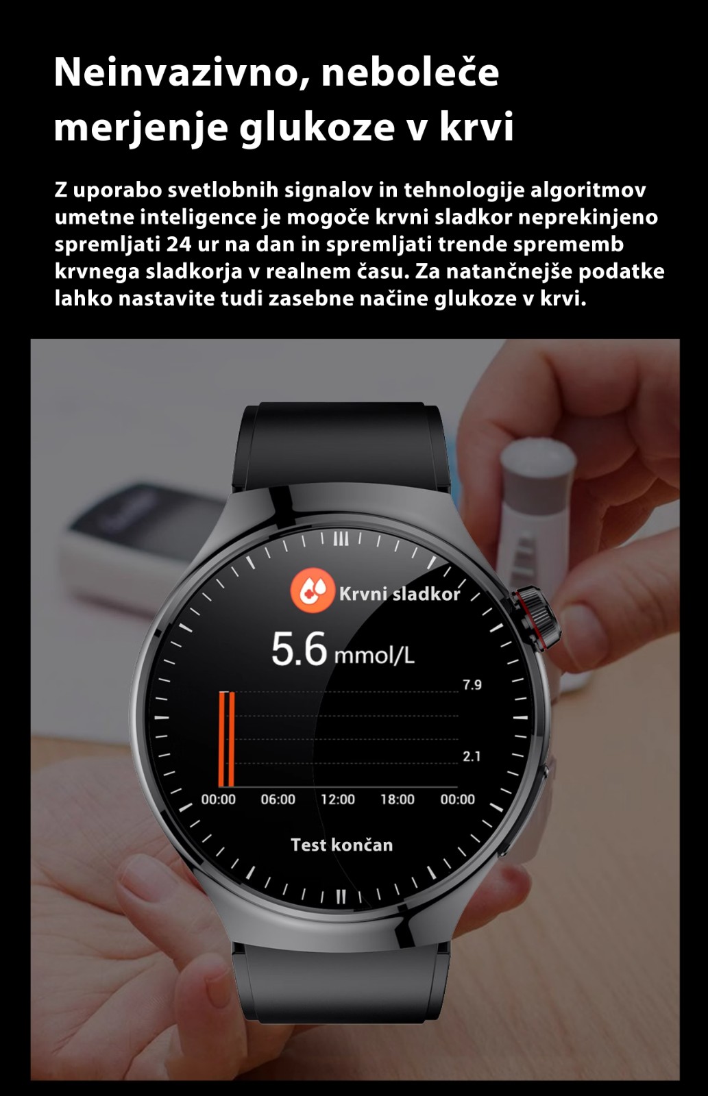 Neinvazivno merjenje krvnega sladkorja/krvnega tlaka + natančno merjenje kisika v krvi in srčnega utripa